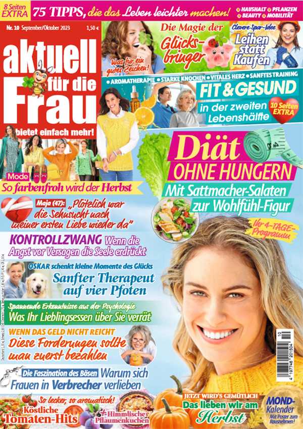 AKTUELL FÜR DIE FRAU ist die klare Nr. 1 und Markführer im Pressesegment der (zwei-)monatlichen serviceorientierten Frauenzeitschriften. Sie bietet ihren Lesern und Leserinnen auf 88 Seiten neben einer Vielzahl von Rezepten und Diät-Tipps auch aktuelle Mode- und Beauty-News sowie viele fundierte Ratgeberthemen rund um Medizin, Recht und Haushalt. Lebensnahe Reportagen und Reiseberichte runden das Konzept ab. Als besonderes Extra ist jede Ausgabe mit einem hochwertigen Stickerbogen ausgestattet.